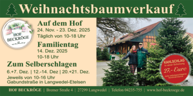 Schöne Weihnachtsbäume verkaufen wir auf unserem Hof Beckröge in Langwedel-Etelsen. Nach Ihrem Weihnachtsbaum-Einkauf bekommen Sie einen Gutschein für heißen Glühwein und Zimtapfelsaft.