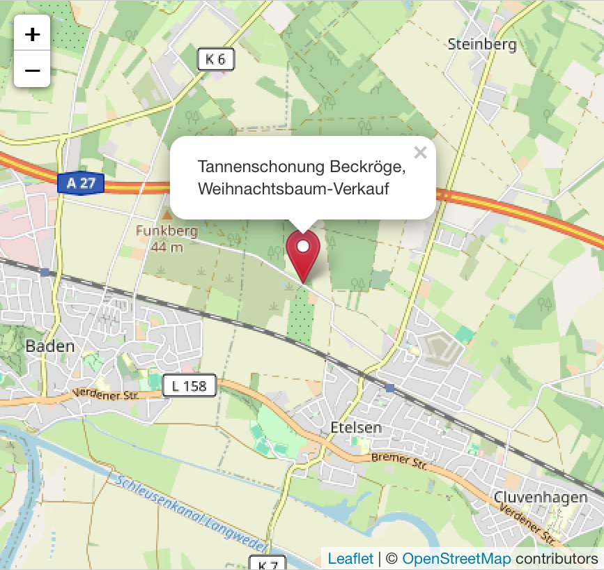 Der Wald / die Schonung ist in der Gabundstraße, 27299 Langwedel OT Etelsen. Bitte parken Sie nicht an der Betonpflasterstraße sondern fahren Sie bis auf das Gelände – wir haben Parkplätzte genug. Sie brauchen dann Ihren Baum nicht so weit tragen. Im Wald haben wir für Sie Schiebkarren, Sägen und Handschuhe.