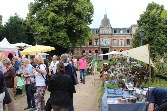 (2) Kunsthandwerkermarkt Etelser Schlossgartenfest mit Blick auf das Etelser Schloss.